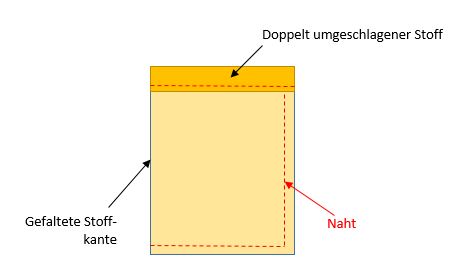3.) Zweiter Nährschritt: Den Stoff rechts auf rechts (also mit der Stoffvorderseite) in der Mitte zusammenfalten. Feststecken und dann die untere und die Seitennaht schließen. Auf der Seite nicht ganz nach oben nähen, damit die Schnur noch durch den vorher genähten Umschlag gefädelt werden kann.