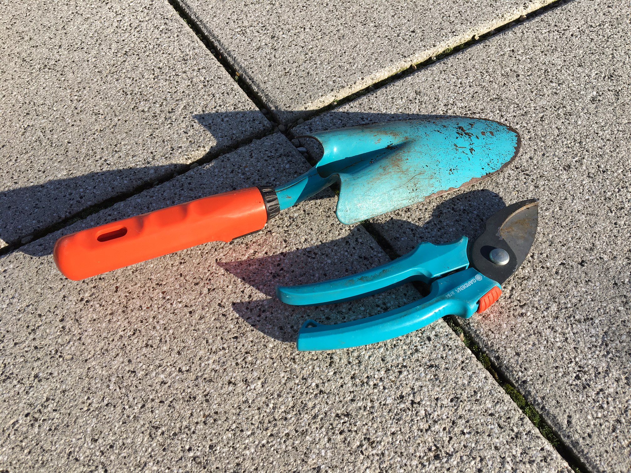 - Arbeitsmaterial, wie Schaufel, Gartenschere, Harke usw. unbedingt von den Erde- und Schmut-Resten befreien. Feuchte Rückstände führen zu Rost und verkürzen so logischerweise die Haltbarkeit erheblich. Auch sollte man die Geräte möglichst vor Feuchtigkeit geschützt aufbewahren. Ich habe mir dazu eine Kunststoff-Box geholt und diese an einen überdachten Abstellbereich gestellt. So habe ich die Sachen griffbereicht, falls ich auch im Winter mal etwas davon benötigen sollte und sie sind dennoch vor Feuchtigkeit geschützt 🙂